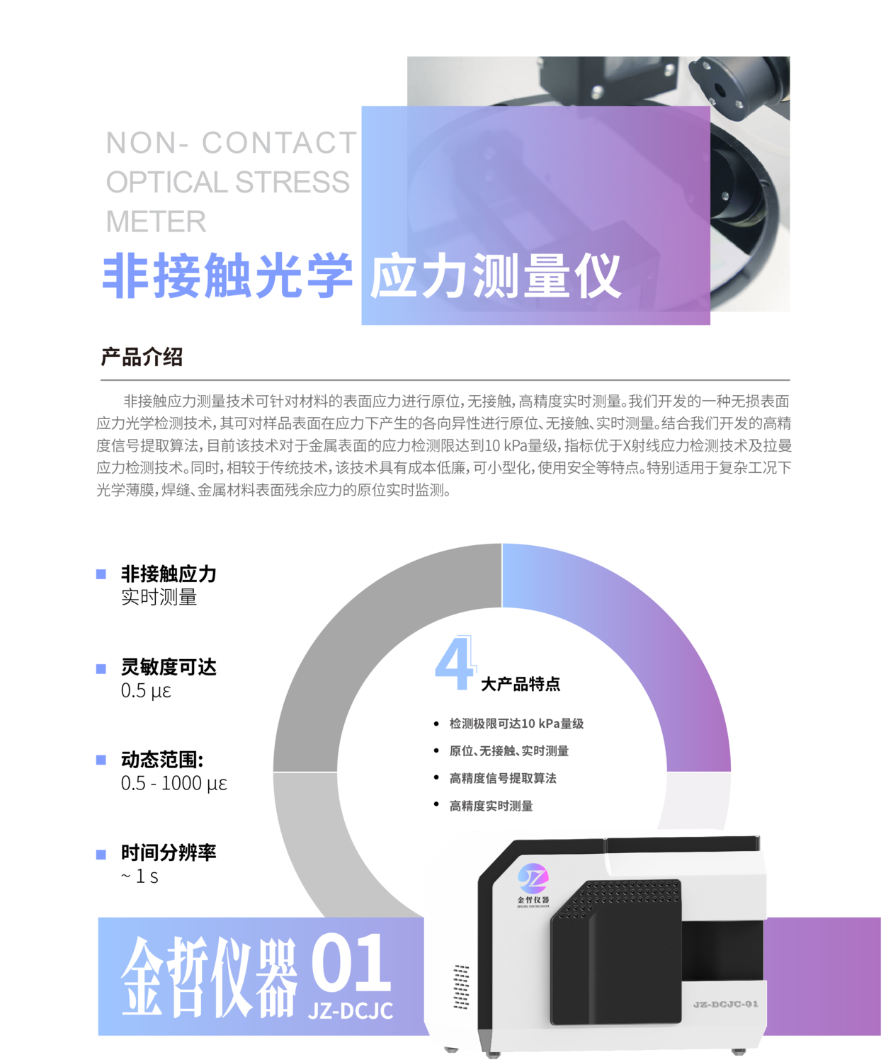 非接触光学应力测量仪发表时间:2024-07-31 13:57 非接触应力测量技术可针对材料的表面应力进行原位,无接触,高精度实时测量。我们开发的一种无损表面应力光学检测技术,其可对样品表面在应力下产生的各向异性进行原位、无接触、实时测量。结合我们开发的高精度信号提取算法,目前该技术对于金属表面的应力检测限达到10kPa量级,指标优于X射线应力检测技术及拉曼应力检测技术。同时,相较于传统技术,该技术具有成本低廉,可小型化,使用安全等特点。特别适用于复杂工况下光学薄膜,焊缝、金属材料表面残余应力的原位实时监测。